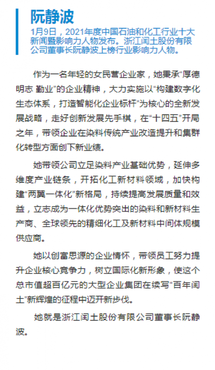 2022年1月9日,由中國石油和化學工業(yè)聯合會指導,《中國化工報》社有限公司主辦的“2021年度石油和化工行業(yè)十大新聞暨影響力人物發(fā)布盛典”采用線上直播的形式舉行。浙江閏土股份董事長阮靜波榮膺“2021年度中國石油和化工行業(yè)影響力人物”。